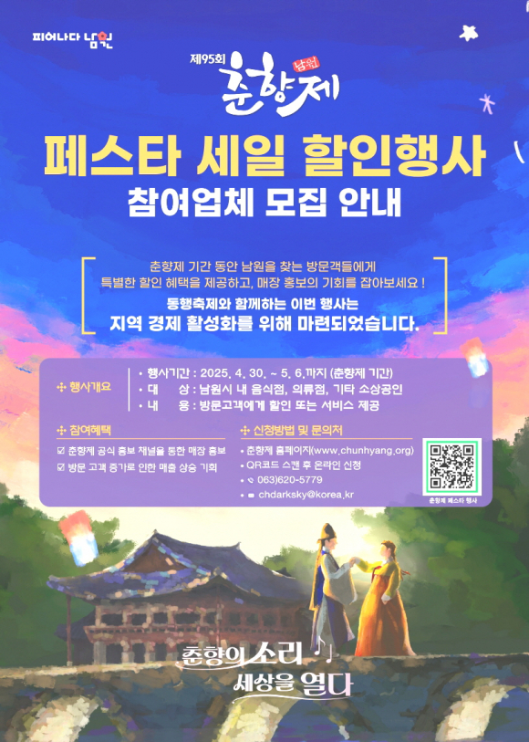 또한 춘향제전위원회는 ‘춘향 세일 페스타’에 참여할 지역 상점을 모집한다. 참여 대상은 남원시 내 음식점, 카페, 숙박업소, 전통시장, 특산물 판매점, 사진관 등 다양한 업종으로, 할인 행사와 프로모션을 통해 춘향제를 찾는 방문객들에게 특별한 혜택을 제공할 수 있다. 신청을 원하는 업체는 오는 시청 홈페이지를 참고하여 메일 및 QR코드 스캔 후 신청서 제출하면 되고, 선정된 업체에는 홍보 지원과 함께 춘향제 공식 홈페이지 및 온·오프라인 광고를 통한 홍보 혜택이 주어진다.
