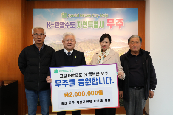 나윤채 씨는 대전광역시 동구에서 재생용 재료 수집과 판매를 하는 사업체를 운영 중으로 2024년에도 고향사랑기부금 2백만 원을 무주군에 기탁한 바 있다. 지난해 12월에는 제6대 대전동구체육회 자전거연맹 회장으로 선출돼 활동 중이다. |