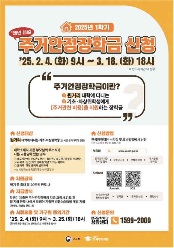 한국장학재단과 교육부는 원거리 대학 진학으로 주거비 부담이 큰 기초·차상위 대학생들에게 월 최대 20만 원을 지원하는 주거안정장학금을 운영 중이다.