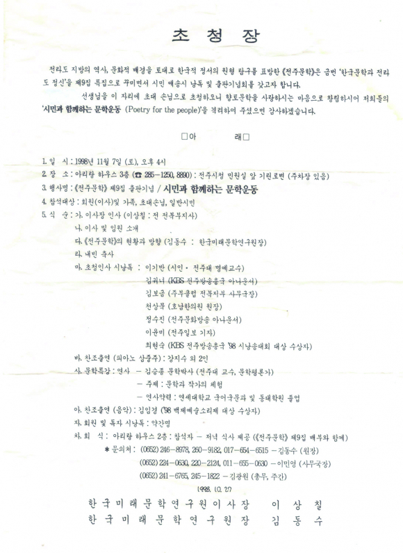 월례 전주 문학마당 주최하다(2000.5.10.) 한국미래문학 연구원(원장 김동수)의 숙원사업이었던 사단법인화를 김영구 이사장님과 김대곤(전북대 의대 내과), 이현도(전인석유 대표), 최경수(한마음 병원장), 최진호(전주시의원), 한익수(전북교육위원) 이사들의 협조로 등록을 마쳤다. 그런가 하면 ‘시민과 함께 하는 문학 운동(Petry for the People)’을 벌여 ‘월례 전주문학마당’을 현대문화센타에서 개최하게 되여 양병호 전북대 국문과 교수(5월) 김성희 백제대 교수(6월) 김자연 박사(9월) 강연호 원광대 교수(10월) 이희중 전주대 교수(11월) 최원식 작가(12월)들이 주제 강연을 하고, 애송시 낭독 초대 손님으로 이재천 전주시의원, 정진호 더불어 사는 전주 편집장, 조은형 원음방송부장, 강명희 전북제일신문 기자, 박일두 MBC 진행자, 신경숙 자연사랑회회장, 임광진 전주 시립도서관장 등이 참여하여 문학의 대중화와 새로운 토론문화 창출에 기여하기도 하였다.