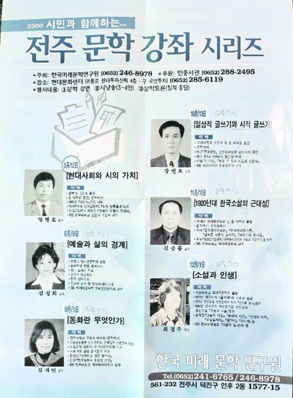 시민과 함께 하는 전주문학강좌 문학대중화 운동이 활발해진다. 시문학강좌의 활성화 붐을 타고 문단에 데뷔하는 시인들이 급격히 늘어났던 90년대의 지역 문학환경이 다시 새롭게 변하고 있는 것. 몇몇 동인 중심의 문학모임과 문학강좌가 지금도 꾸준히 이어지고 있는 속에서 좀더 본격적인 문학강좌가 자리를 잡는다. 한국미래연구원(원장 김동수)이 여는 ‘시민과 함께 하는 전주문학강좌’. 한 달에 한 번, 5월부터 시작되는 이 문학강좌는 단순히 글쓰기의 지도 뿐 아니라 문학에 대한 시각과 자기중심을 세울 수 있는 다양한 주제들이 다루어진다. 현직 대학교수들과 시인 소설가들이 각각의 주제를 갖고 강의에 나서는 이번 문학 강좌에서는 ‘현대사회와 시의 가치’(양병호, 전북대 교수) ‘예술과 삶의 경계’(김성희, 백제예술대 문예영상창작과 교수) ‘동화란 무엇인가’(김자연, 아동문학평론가) ‘일상적 글쓰기와 시적 글쓰기’(강연호, 원광대 교수) ‘1920년대 한국소설의 근대성’(김승종, 전주대 교수) ‘소설과 인생’(최정주, 소설가) 등 문학 각 분야에 대한 인식을 높이는 내용들이다. 미래문학연구원은 매월 한번 씩 여는 문학 강좌에서 강연과 함께 시인들의 시낭송과 문학토론을 열어 일반인들의 문학에 대한 관심을 높이고 문화행사로 정착시켜갈 계획이다. 문학강좌에는 누구나가 참여할 수 있으며 장소는 관통로 현대투자신탁 4층. 자세한 문의는 한국미래연구원(전화 246-8978). 월별 강의내용과 일정은 다음과 같다.강좌시간은 오후 7시. (전북일보 김은정 기자, 2000.5.10)
