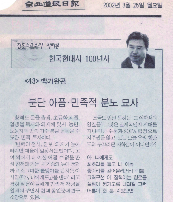 ◆ 전북도민일보에 한국현대시 100년사 연재 2001년 3월 5일부터-2004년 7월 5일까지 전북도민일보 이영진 기자의 권유로 <김동수 교수가 바라본 한국현대시 100년사>를 매주 월요일 아침 전북도민일보에 연재하게 되었다. 1900년대 육당 최남선부터 2002년대에 이르기까지 한국현대시사에서 비중 있게 다루어야할 시인 100인의 작품세계와 이면사를 새로운 시각에서(민족 주체와 예술미학이란 측면에서) 다루고자 하였다. 그때 첫 호에 편집자가 이 연재의 성격과 내용을 아래와 같이 소개하였다. 심금을 울리는 명시 한 편으로 한 주일을 시작해 보면 어떨까?‘김동수 교수가 바라 본 한국현대시 100년사’를 매주 월요일 연재한다. 김동수 교수의 시평을 통해 우리에게 잘 알려진 명시들의 새로운 맛을 느낄 수 있을 것으로 기대되고 수험생들에게는 논문 작성에 도 큰 도움이 될 것으로 보인다. <편집자 주> -전북도민일보, 2001.3.5.