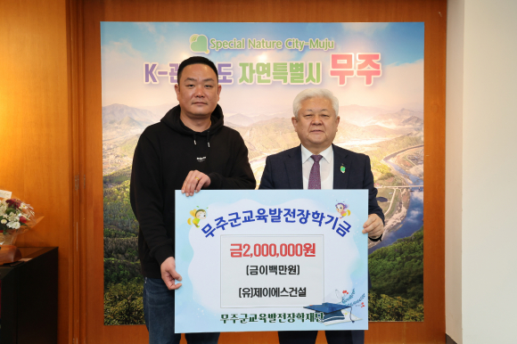 (유)제이에스건설 장민성 대표가 지난 9일 (재)무주군교육발전장학재단(이사장 황인홍 무주군수)에 장학금 2백만 원을 기탁했다.