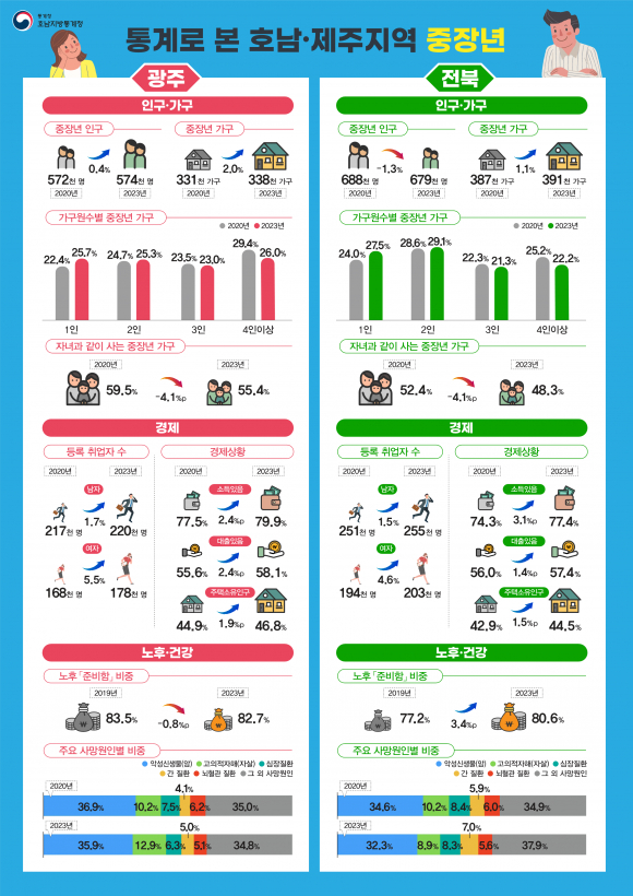 이번 조사는 통계청이 2020년과 2023년 사이 전북 지역 중장년층의 인구·가구, 경제, 건강 등 주요 지표를 비교 분석한 자료를 토대로 작성됐다. 관련 통계는 향후 지역 맞춤형 복지정책 수립에 중요한 기초자료로 활용될 전망이다.