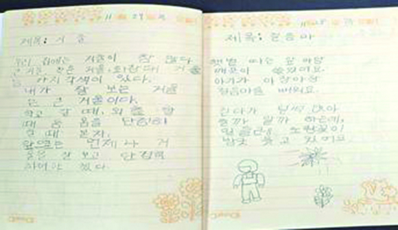 <거울> 우리 집에는 거울이 참 많다. 큰 거울, 작은 거울, 화장대 거울 등 가지각색의 거울이 있다. 내가 잘 보는 거울은 큰 거울이다. 학교 갈 때, 외출 할 때 등, 몸을 단정히 할 때 본다. 앞으로는 언제나 거울을 잘 보고 단정히 하여야 겠다. (1988.11. 27)