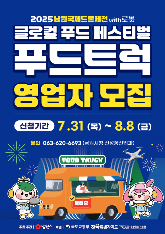남원시(시장 최경식)는 오는 10월 16일부터 19일까지 개최하는 ‘2025 남원국제드론제전 with 로봇’의 성공적인 운영과 관람객 편의를 위해 ‘글로컬 푸드 페스티벌’ 푸드트럭 영업자를 공개 모집한다.