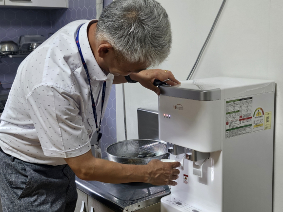 부영1차아파트 주민은 기존 정수기가 있었지만 고장이 나 폐쇄신고 하였고, 냉온수기로 대체를 해온 상태였는데, 냉온수기 물통을 들어 올리고,내려놓는게 너무나 허리도 아프고, 무거운 냉온수기 물통이 고통이었는데 이렇게 시원하게 건강한 여름을 날수 있도록 “얼음정수기”를 설치해 주어서 연일지속되는 폭염에 수분섭취와 건강을 챙길수 있어서 좋다고 말했다.