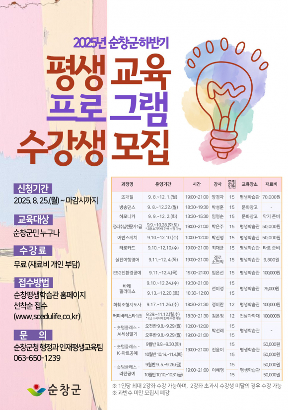 순창군이 오는 9월 5일까지‘2025년 하반기 평생교육 프로그램’수강생을 선착순 모집한다.