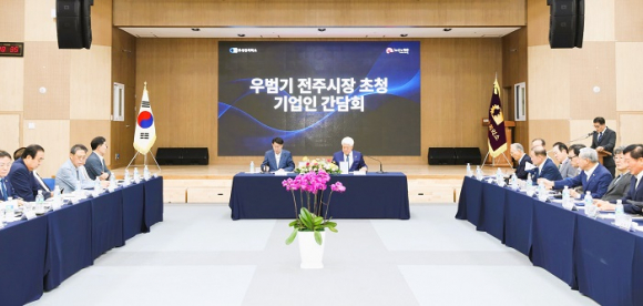 전주상공회의소가 우범기 전주시장을 초청해 기업인 간담회를 열고, 경제 활성화를 위해 머리를 맞댔다.