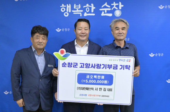 순창 출신 기업인 (주)대한패브릭 서한집 대표이사가 23일 순창군에 고향사랑기부금 500만원을 전달하며 올해로 3년째 고향사랑을 실천했다.
