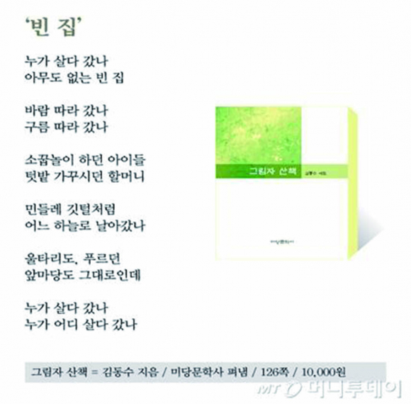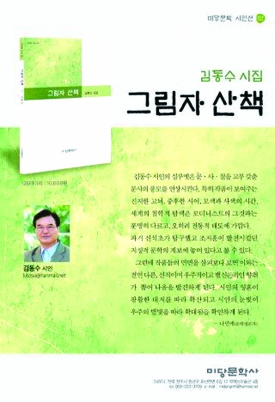 우주론적 ‘그림者’의 세계 포옹 김동수 시인의 실루엣은 문·사·철을 고루 갖춘 문사의 풍모를 연상시킨다. 특히 작품이 보여주는 진지한 고뇌, 중후한 시어, 모색과 사색의 시간, 세계의 철학적 탐색은 모더니스트의 그것과는 분명히 다르고, 오히려 전통적 태도에 가깝다. 그 중에서도 정서 중심과 자연 찬미의 계열보다는, 과거 신석초가 탐구했고 조지훈이 발전시켰던 지성적 문학의 계보에 놓여 있다고 볼 수 있다. 그런데 작품들의 면면을 살펴보다 보면 이와는 전연 다른, 선적이며 우주적이고 범신론적인 향취가 뿜어 나옴을 발견하게 된다. 이 시집에서 가장 뛰어난 작품들을 읽는 중에는 시인의 영혼이 광활한 대지를 따라 확산되고 시인의 눈빛이 우주의 별빛을 따라 확대됨을 확인하게 된다. 과연 고전적인 지성의 사유와 범신론적이며 우주적인 태도가 공존하는 것은 가능할까. 누구도 함부로 ‘가능하다’고 말하지 못했던 것에 대해 김동수 시인은 강한 어조로 긍정하고 있는 듯하다. 특히 그의 이번 시집은 마치 그 공존의 가능성을 증명하는 것처럼 보인다. 즉 지적인 사유와 우주적인 상상력의 결합을 동시에 긍정하고 있다. *나민애: 문학평론가 작품 해설에서 김동수 제9시집 ‘그림자 산책’ 김동수 시인이자 백제예술대 명예교수는 제8시집 ‘그림자 산책’(미당문학사·1만원)을 문단에 선보였다. 이 시집에서 김동수 시인은 혼돈의 시대를 살아가는 도시 현대인들에게 명상과 자기회복이라는 명제를 던졌다. 이번 책은 김 시인이 대표로 있는 ‘미당문학사’에서 처음으로 간행한 시집이다. 시인은 “지나고 보니 나는 우주라는 거대한 사이클 속에서 잠시 지나가는 과객이며 그림자였다”고 토로한다. 나민애 문학평론가는 “시인은 ‘그림자 산책’에서 시작을 다시 시작했다”고 평하면서 새로운 시작의 경지를 개척한 시인에게 찬사의 박수를 보냈다. 시인의 계보에 대해 “신석초가 탐구했고 조지훈이 발전시킨 지성적 문학의 계보에 놓여있다”며 “시인의 영혼이 광대한 대지를 따라 확산되고, 우주 위 별빛 따라 확대되고 있다”고 설명했다. 백제예술대학에서 그간 45년의 교직을 마치고서 정년을 맞이해, 이제는 평범한 시민의 삶으로 돌아온 김동수 시인. 그로부터 4년이 훌쩍 넘은 지금, 그의 원동력은 시집 ‘그림자 산책’에서 던지고 있는 명제처럼 일상의 삶에서 건져 올린 긍정의 힘이다 김동수 시인은 전북 남원 출신으로 1981년 ‘시문학’으로 등단했고, 한국비평문학상, 시문학상, 대한문학상 등을 수상했다. 온글문학, 미당문학 발행인 등으로 있으며, 문단을 위한 시 창작 강의도 꾸준히 전개 중이다. 시집으로는『말하는 나무』, 『흘러』 등 8권이 있고,『한국현대시의 생성미학』, 『시적 발상과 창작』 등 다수의 평론집도 있다. * 전북도민일보 김영호 기자:2016.11.3.