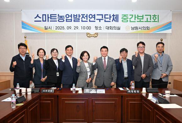 남원시의회 스마트농업발전연구단체(대표의원 김한수)가 지난 9월 29일 남원시의회 대회의실에서 「남원시 스마트농업 발전방안 연구용역」 중간 보고회를 개최했다.