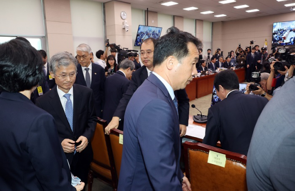 이에 민주당 추미애 법사위원장은 인사말 후 조 대법원장을 그대로 증언석에 남겨 질의하려 했고, 국민의힘 의원들이 “사법부 수장을 정치적으로 압박하려는 행위”라며 반발하면서 감사장은 아수라장이 됐다.