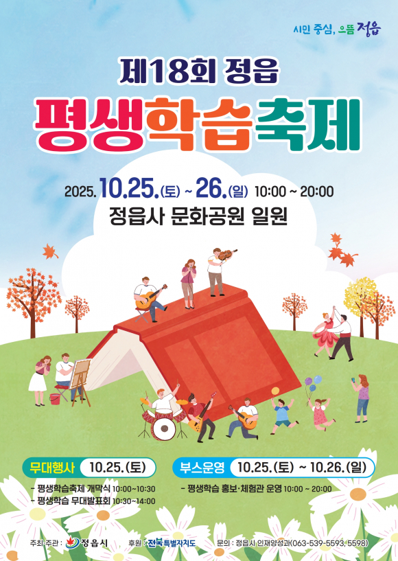 시민들이 한 해 동안 갈고닦은 배움의 성과를 나누는 ‘제18회 정읍 평생학습축제’가 오는 25일과 26일 이틀간 정읍사문화공원 일대에서 열린다. 올해 축제는 다채로운 무대 공연과 온 가족이 함께 즐길 수 있는 풍성한 체험 프로그램으로 채워질 예정이다.