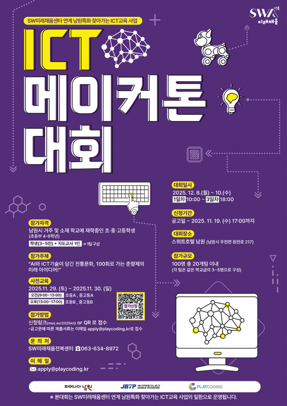 전북테크노파크(이하 전북TP)는 남원시 소프트웨어(SW) 지역특화 교육사업의 일환으로 '2025 ICT 메이커톤 대회' 참가자를 11월 19일 17시까지 모집하고 있다고 밝혔다.