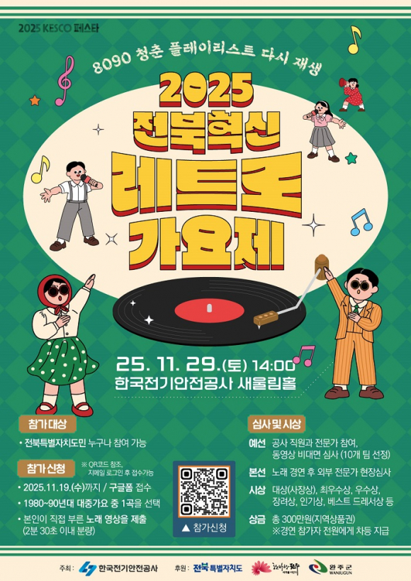 한국전기안전공사는 오는 29일 오후 2시 전북 완주군 본사 새울림홀에서 열리는 ‘2025 전북혁신 레트로 가요제’의 참가자를 모집한다고 14일 밝혔다.