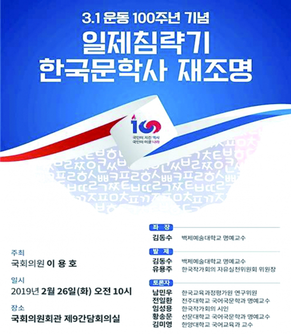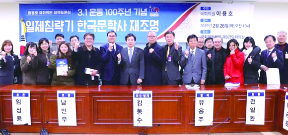 이용호 의원(남원·임실·순창)은 26일 오전 10시 국회의원회관 제9간담회의실에서 ‘3.1운동 100주년 기념 일제침략기 한국문학사 재조명 정책토론회’를 개최했다. 이날 토론회에서는 제20대 국회 전반기 교육문화체육관광위원회 위원장을 역임한 유성엽 민주평화당 의원, 임재훈 국회 교육위원회 바른미래당 간사 등 국회의원과 정부, 학계, 문학계, 교육계 인사가 참석한 가운데, 일제강점기 저항문학 발굴 및 연구 필요성을 확인하고 친일문인 기념문학상 문제를 논의했다. 이날 첫 번째 발제자로 나선 김동수 백제예술대학교 명예교수는 “일제강점기 국내에서 발간된 문학은 조선총독부의 검열을 거쳐야 했던 반면, 망명·지하문학에는 표현의 자유가 있었고, 저항의지가 고스란히 담겨있다”며, “그런데도 중·고교 교과서는 국내문학만을 중심으로 다루고 있다”고 주장했다. 이어 김 명예교수는 “아직 빛을 보지 못한 망명·지하문학이 상당히 많다. 이를 발굴하고 연구해 교과서에 편입시킬 필요가 있다”며, “이 같은 작업은 문화체육관광부 등 정부에서 체계적으로 진행해야 한다”고 덧붙였다. 발제를 맡은 유용주 한국작가회의 자유실천위원회 위원장은 “문인과 문학은 공은 공대로, 과는 과대로 공과를 정직하게 기록해야한다”며, “시대에 편승해 이익을 취한 사람들의 행적 역시 후대에 뚜렷이 알려야 한다. 이 같은 맥락에서 친일문인 기념문학상 폐지 주장이 수십 년 전부터 이어져온 것”이라고 지적했다. 또 유 위원장은 “친일문인 기념문학상은 생계가 어려운 작가들의 사정을 수 천 만원에 달하는 상금으로 교묘하게 이용하는 측면도 있다”며, “문학은 약자 편에 서는 것이 참모습이고, 뻔히 패배할 줄 알면서 싸우는 것이 본질이다. 이를 저버린 친일문인들의 문학상을 작가들 스스로 부끄럽게 느낄 수 있도록 해야 한다”고 덧붙였다. 이어진 본 토론에서 남민우 한국교육과정평가원 연구위원은 “3.1운동의 총체적 의미를 학생들에게 교육하기 위해서는 3.1운동 이후 해외망명인사들의 항일저항문학 작품을 발굴, 수집하는 작업이 일차적으로 요구된다”며, “자료 자체가 다양한 국가에 산재해 있고, 해당 국가에서 체계적으로 정리하고 있지도 않은 형편이므로, 국가 차원의 적극적 지원이 필수”라고 주장했다. 아울러 남 연구위원은 “학교 교육현장에서 3.1운동 정신을 문학적으로 형상화한 작품에 대한 교육, 해외동포의 항일저항문학 작품에 대한 교육 등을 적극적으로 펼칠 수 있도록 법적·제도적 정비 역시 요구된다”고 덧붙였다.