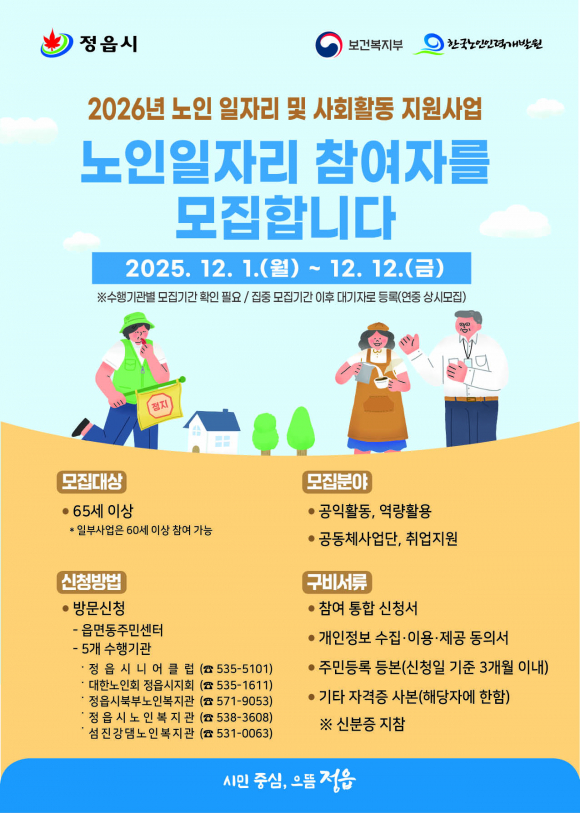 참여를 희망하는 어르신은 신분증과 신청일 기준 3개월 이내에 발급된 주민등록등본을 지참해 각 수행기관을 방문하면 된다. 사업 수행기관은 정읍시니어클럽(535-5101), 대한노인회정읍시지회(535-1611), 정읍시노인복지관(538-3608), 정읍시북부노인복지관(571-9053), 섬진강댐노인복지관(531-0063) 등 5곳이다.
