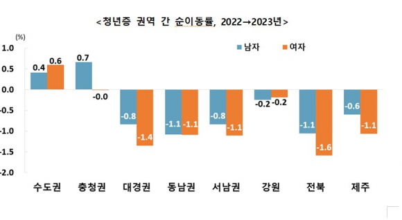 성별 이동에서도 전북의 청년층 이탈은 심각한 수준으로 나타났다. 전북 남성 청년층 순이동률은 2022년 대비 2023년에 -1.1%p였고, 여성 청년층은 -1.6%p로 전국 권역 중 가장 큰 감소폭을 기록했다.