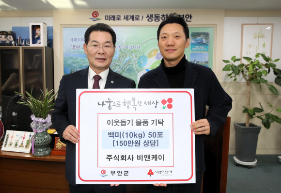 부안군은 ㈜비앤케이(대표 봉찬형)가 지난 2일 지역의 어려운 이웃을 돕기 위해 백미 10kg 50포(150만원 상당)를 군에 기탁했다고 밝혔다.