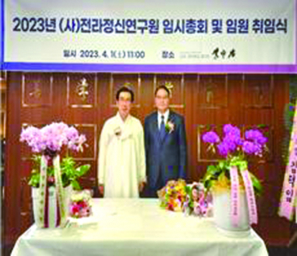 3. 전라정신연구원, 김동수 이사장·김인술 원장 취임식 개최 ㈔전라정신연구원은 1일 전주 이중본에서 제2대 김동수 이사장과 김인술 원장 취임식을 개최했다. 이날 취임식은 올해 전라정신연구원 사업 현황을 보고하는 임시총회와 함께 진행됐다. 전일환 전 이사장, 최무연 전주예총 회장, 이덕춘 변호사, 김종량 전북일보 편집국장, 김형길 전주대 불문과 명예교수, 이병채 남원문화원장, 박병익 라이온스전북 총재, 박희정 ㈔한국농경문화원 이사장, 김윤철 전주시의원, 이구한 미당문학 편집주간, 재전 부안부령김씨 전주 종친회 회원 등 총 60여명이 참석했다.(2023.4.1.) 김 이사장은 “전라도는 고대 아시아 무역의 중심지로서 찬란한 백제 문화의 꽃을 피워 고구려 신라는 물론 일본의 아스카문화에 크게 영향을 끼쳐던 문화왕국이었고 조선 500년 왕조의 발상지였다”며 “한반도의 왕도 전라도에 찬란했던 백제 문화의 꽃이 다시 피어날 수 있는 마중물이 되는 전라정신연구원을 만들어 갈 것”이라고 말했다. 진안에서 온생명평생교육원을 운영하고 있는 김 원장은 취임사에서 “전라정신은 한국을 대표한 정신으로 오늘을 살아가는 우리들이 이어받아 미래로 나아가는 발판을 마련하는 데 최선을 다하겠다”고 다짐했다. 전라정신연구원은 2019년 6월에 설립된 이후 전라도의 혼이 깃든 역사, 문화, 예술, 인물 등을 연구·조사하고 민주문화시민의 상 건립을 목표로 설립돼 현재까지 전라정신 연원을 탐구하는 학술 기관지 ‘전라정신’ 4집을 발간했다. 전라정신연구원은 17일 김제시 후원으로 만경문화 원류 찾기의 일환으로 ‘진표·진묵·탄허 정신 학술세미나’를 개최하고 회원들과 함께탄허 생가, 석모암, 망해사 등지로 만경 불교의 길 역사 탐방을 실시할 예정이다. -전북일보 김영호 기자2023. 4.4) |