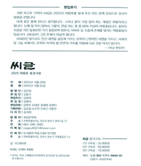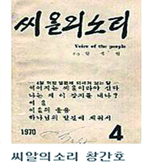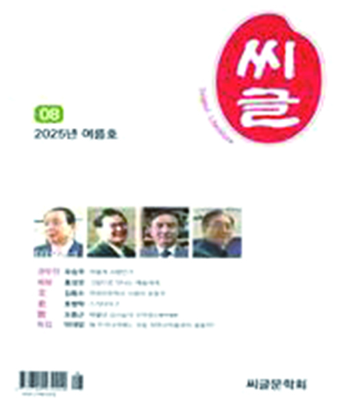 발간 배경 전북 전주에서 오래동안 출판업을 하고 계신 김인창 선생께서 지역 문인들의 어려움을 아시고 1년에 네 차례 계간지를 발간해 드릴테니 좀더 격조 있는 문예지를 만들어 지역에 소외되어 있는 작가들에게 작품의 발표 기회를 드리라고 하셨다. 그래서 위 창간사에서 밝힌 바와 같이 주제나 소재도 기존의 문학과는 달리, 문사철(文史哲)을 중심으로 한 인간성 회복과 자연, 환경, 그리고 다양한 분야의 취미와 오락 등에도 폭넓은 관심을 가져야 할 것이다. 이에 생명과 정신의 껍데기를 깨고나와 나를 꽃피우고 세상을 보다 아름답게 일구어 가자는 의미에서『씨글』문예지를 창간하기에 이르렀다. 문사철(文史哲)을 중심으로 한 문예지를 발간하기로 하고 위 사진(우측)과 같이, 편집 주간: 김동수, 편집장 유대준(시인, 전주문협회장), 편집위원 김광원(시인, 문학박사), 김현조(시인, 전북시인협회장), 정재영(시인,한일고 교사), 하송(아동문학가), 호병탁(시인, 문학박사), , 기획위원에 김승필, 소은옥, 오종근, 최종만, 이렇게 편집진을 구성하고 신인을 발굴해 가면서 우선 반년간지로 일 년에 상반기(6월 말) 하반기(12월) 두 차례 발간하기로 하여 현재 8집 인쇄 중에 있다. 제호를 ‘씨글’로 정한 이유 또한 창간사에서 밝힌 바와 같이 ‘생명과 정신의 껍데기를 깨고나와, 나를 꽃피우고 세상을 보다 아름답게 일구어 가는 씨앗과 같은 글’을 쓰자는 의미에서『씨글』이라 정했는데, 여기에는 1950~60년대 한국 지식인 사회의 담론을 선도했던 『사상계思想界』와 1970년대 함석헌 선생이 주도했던 교양평론지 『씨알의 소리』 정신을 이어 받자는 의에서 ‘씨알의 소리’에서 따온 ‘씨(종자)’와 ‘글(文)’이 합쳐 ‘씨글’이 된 것이다. |