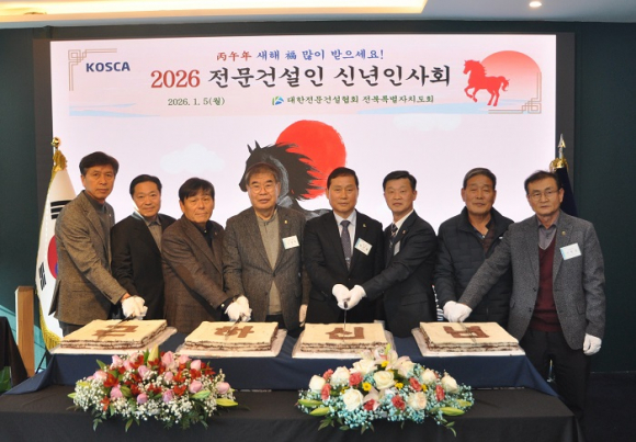 전북 전문건설업계가 병오년 새해를 맞아 위기 속에서도 도약을 다짐하며 한자리에 모였다. 대한전문건설협회 전북특별자치도회는 5일 원로임원과 도회 운영위원·감사, 지역별·업종별 협의회 임원 등 50여 명이 참석한 가운데 ‘2026년 병오년 신년인사회’를 개최했다.