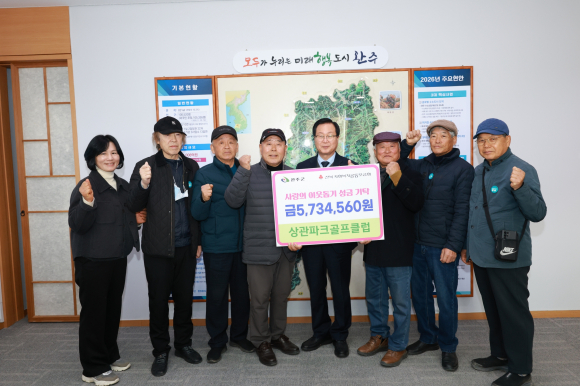 완주군 상관파크골프클럽이 최근 군수실에 방문해 상관면을 위해 사용해 달라며 후원금 573만 4,560원을 전달했다.