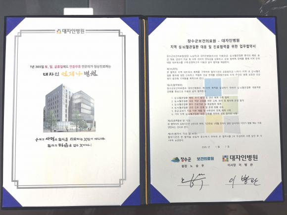 장수군은 대자인병원과 심뇌혈관질환 발생 시 신속하고 효과적인 대응을 위해 상호 진료협력 체계를 구축하는 ‘심뇌혈관질환 대응 진료협력 협약(MOU)’을 체결했다고 9일 밝혔다.