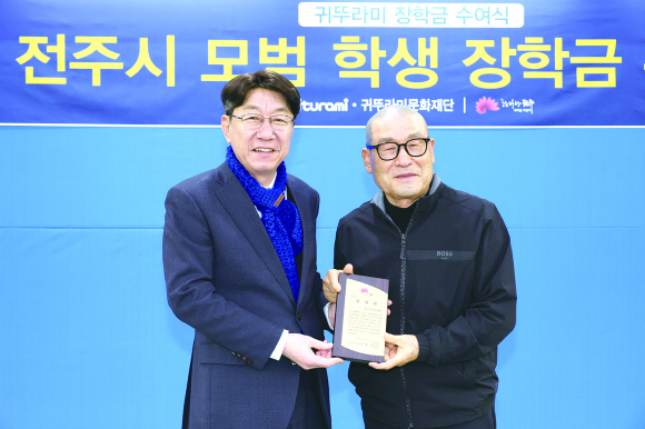 전주시와 귀뚜라미그룹이 지역 인재 육성을 위해 손을 맞잡았다. 전주시와 귀뚜라미그룹은 9일 시청 4층 회의실에서 우범기 전주시장과 최진민 귀뚜라미그룹 회장, 장학생 등 50여 명이 참석한 가운데 ‘전주시–귀뚜라미문화재단 모범 학생 장학금 수여식’을 개최했다. 이날 수여식에서는 학업 성적이 우수한 학생을 비롯해 체육 특기생 등 다양한 분야에서 선발된 전주지역 중·고등학생 20명과 대학생 10명, 총 30명에게 장학 증서와 함께 5000만 원의 장학금이 전달됐다. 장학금은 중·고등학생에게 각 100만 원, 대학생에게는 각 300만 원씩 지원됐다. 귀뚜라미문화재단은 2024년까지 전주지역 학생 80명에게 총 1억 5000만 원을 후원해 왔으며, 올해 지원분을 포함하면 누적 지원액은 2억 원에 이른다. 지역 청소년과 청년들이 학업에 전념할 수 있도록 꾸준한 지원을 이어오며 전주 인재 양성의 든든한 버팀목 역할을 하고 있다. 최진민 회장은 “교육 기회의 평등은 기업이 사회에 환원할 수 있는 가장 가치 있는 투자”라며 “이번 장학금이 학생들이 꿈을 키우고 전주의 미래를 이끌어가는 데 작은 디딤돌이 되길 바란다”고 말했다. 전주시 관계자는 “해마다 지역 학생들을 위해 나눔을 실천해 온 귀뚜라미그룹에 깊이 감사드린다”며 “전주시도 학생들이 꿈을 포기하지 않고 지역사회에 기여하는 인재로 성장할 수 있도록 교육복지 환경을 더욱 강화하겠다”고 밝혔다. 한편 귀뚜라미그룹은 귀뚜라미문화재단과 귀뚜라미복지재단을 통해 지난 41년간 장학사업과 학술연구 지원, 사회복지시설 후원 등 총 610억 원 규모의 나눔 경영을 이어오며 기업의 사회적 책임을 실천하고 있다. |