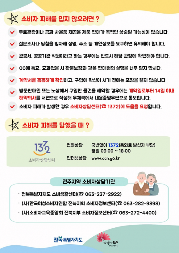 이에 전주시는 무료 체험이나 경품 제공을 앞세운 판매 방식에 대한 주의, 계약 체결 시 계약서 필수 수령과 14일 이내 청약 철회 가능 여부 확인, 개인정보 요구 시 수집·이용 목적 확인 등 핵심 예방 수칙을 집중 홍보할 계획이다.