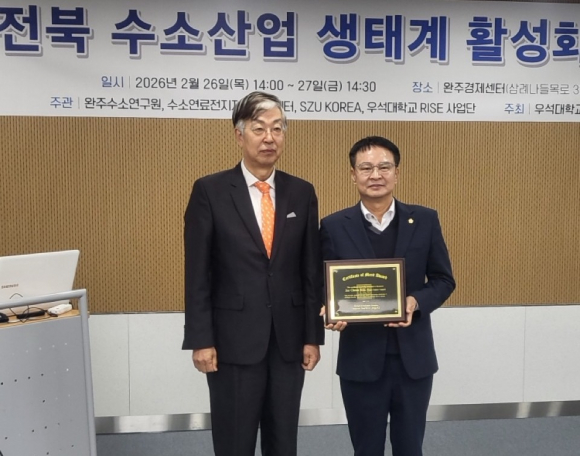 시상식은 완주경제센터에서 열린 ‘전북 수소산업 생태계 활성화 워크숍’ 현장에서 진행됐다. 김 부의장은 완주군의 수소 특화 국가산업단지 유치 추진과 수소 산업 관련 조례 제정, 거버넌스 체계 구축 등에 앞장서며 지역 수소 생태계 기반을 다진 공로를 높이 평가받았다.