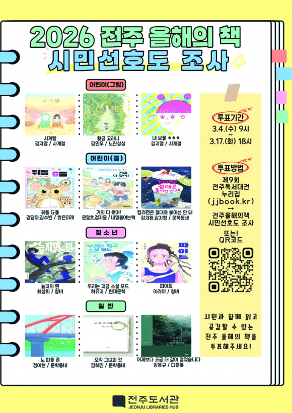 전주시가 시민들과 함께 읽을 ‘2026 전주 올해의 책’을 시민 투표로 결정한다. 전주시는 오는 17일까지 전주독서대전 누리집을 통해 ‘2026 전주 올해의 책’ 선정을 위한 온라인 시민 선호도 조사를 진행한다고 4일 밝혔다. 시민들이 직접 참여해 한 해 동안 함께 읽고 공감할 책을 고르는 방식이다. ‘전주 올해의 책’ 사업은 책을 매개로 독서공동체를 형성하기 위해 2019년부터 추진된 시민 독서운동으로, 매년 전주를 대표하는 책을 시민과 함께 선정하고 다양한 연계 프로그램을 운영해 왔다. 올해는 시민 739명이 후보 도서를 추천했으며, 중복을 제외한 203권 가운데 내부 심의와 전주독서대전 실무기획단 선정위원회의 검토를 거쳐 4개 부문 12권이 최종 후보로 선정됐다. 어린이 그림 부문 후보는 ‘시계탕’(권정민), ‘황금 고라니’(김민우), ‘내 보물 ㅎㅎㅎ’(김지영)이다. 어린이 글 부문은 ‘쥐들 G들’(강담마 글·김수빈 그림), ‘거의 다 왔어!’(윤일호 글·정지윤 그림), ‘컵라면은 절대로 불어선 안 돼’(김지완 글·김지형 그림)가 후보에 올랐다. 청소년 부문은 ‘늪지의 렌’(최상희), ‘우리는 지금 소설 모드’(하유지), ‘파이트’(이라야)가 후보이며, 일반 부문은 ‘노 피플 존’(정이현), ‘오직 그녀의 것’(김혜진), ‘어제보다 조금 더 깊이 걸었습니다’(김용규)가 이름을 올렸다. 시민 선호도 조사는 전주독서대전 누리집에서 참여할 수 있으며, 각 부문에서 가장 많은 표를 얻은 책 1권씩 총 4권이 ‘2026 전주 올해의 책’으로 최종 선정된다. 선정 결과는 오는 19일 전주독서대전 누리집과 전주도서관 누리집을 통해 발표될 예정이다. 선정된 도서는 4월부터 진행되는 100일 필사, 시민 공모전, 저자 초청 강연, 가족 독서 골든벨 등 ‘제9회 전주독서대전’과 연계한 다양한 독서 주제 도서로 활용된다. 이영섭 전주시 도서관평생학습본부장은 “시민들이 함께 읽고 소통할 책을 선정하는 과정에 많은 관심과 참여를 바란다”며 “앞으로도 시민들이 독서를 통해 경험과 생각을 나누는 문화를 지속적으로 확대해 나가겠다”고 말했다. |