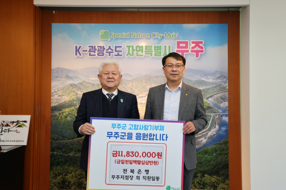 전북은행 무주지점은 지난 2023년부터 4년 연속 고향사랑 기부에 동참(7,343만 원 기탁)하며 ‘고향사랑 무주사랑’ 홍보에 앞장서고 있다.