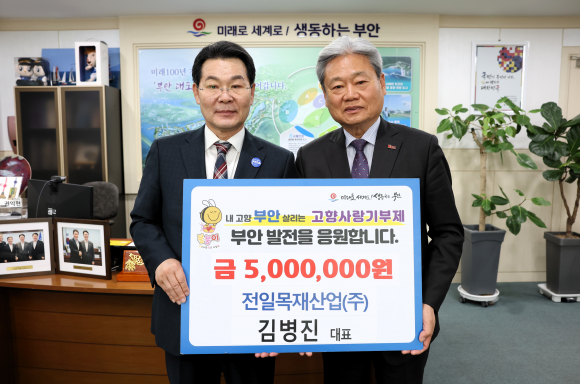 부안군은 지난 12일 김제시에 소재한 전일목재산업㈜‧㈜전일우드텍 김병진 대표가 부안군 고향사랑기부금 500만원을 기탁했다고 밝혔다.