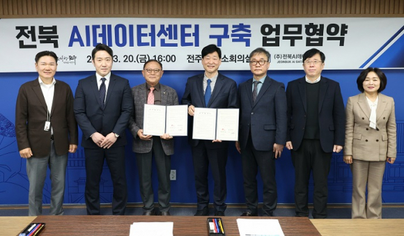 전주시와 ㈜전북에이아이데이터센터는 20일 시청에서 ‘전북 AI 데이터센터 구축 및 운영’ 업무협약을 체결했다. 협약식에는 윤동욱 전주시장 권한대행과 이정천 회장을 비롯해 KT 전남전북광역본부, 한국마이크로소프트 관계자 등이 참석해 사업 추진 방향과 협력 방안을 공유했다.