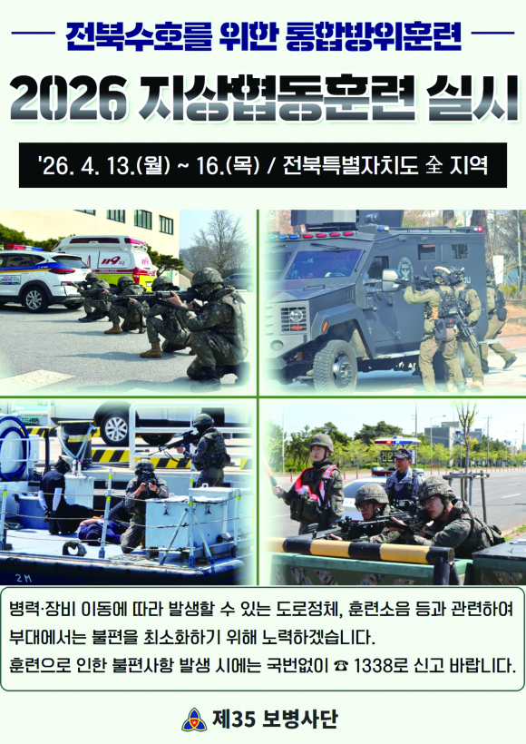 전북 전역에서 병력과 장비가 실제로 이동하는 대규모 군 훈련이 진행된다. 민·관·군·경이 함께 대응하는 통합방위 능력 점검이 목적이다. 육군 제35보병사단은 오는 13일부터 16일까지 3박 4일간 전북특별자치도 전 지역에서 지상협동훈련을 실시한다. 이 기간 백마여단은 임실·장수·남원·순창·진안·무주 등 내륙 지역에서 여단급 전술훈련을 병행한다. 이번 훈련은 복합적인 위기 상황에 대비해 유관 기관 간 협조 체계를 점검하고, 실제 상황에 가까운 대응 능력을 높이는 데 초점을 맞췄다. 병력과 장비가 이동하는 실기동 방식으로 진행되는 만큼 일부 지역에서는 일시적인 교통 불편이 예상된다. 사단 측은 주민 불편을 최소화하기 위한 조치에 나서는 한편, 현장 안전통제팀을 운영해 사고 예방에도 힘쓸 계획이다. 군 관계자는 “지역 방위를 위한 필수 훈련인 만큼 도민들의 이해와 협조를 부탁드린다”며 “훈련 장병들에게 따뜻한 격려를 보내달라”고 밝혔다. 훈련과 관련한 불편 사항은 국번 없이 1338로 신고하면 된다. |
