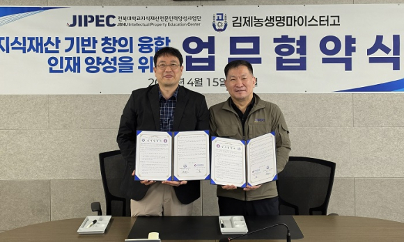 | 전북대학교와 김제농생명마이스터고등학교가 지역 기반 산업 인재 육성을 위해 업무협약을 체결하고 있는 모습.(사진=전북대학교 제공) | 전북대학교와 김제농생명마이스터고등학교가 농생명 바이오 분야 지식재산 전문 인재 양성을 위해 두손을 잡았다. 전북대학교 지식재산전문인력양성사업단과 김제농생명마이스터고는 15일 김제농생명마이스터고에서 ‘지역 기반 산업 인재 육성을 위한 업무협약’을 체결했다고 밝혔다. 이번 협약은 고교부터 대학, 대학원까지 이어지는 단계별 인재 양성 체계를 구축하기 위한 산학 연계 모델로, 농생명 바이오 분야 실무형 지식재산 인재 육성 기반 마련에 초점을 맞췄다. 양 기관은 특허 출원 교육과 발명 캠프 운영, 고교-대학 간 교육과정 연계, 선취업 후진학 지원, 학생 아이디어의 특허화 및 경진대회 참여, 산학 협력 네트워크 구축과 취업 연계 등을 공동 추진하기로 했다. 이를 통해 종자산업과, 스마트팜산업과, 바이오식품과 학생들은 전공 기술과 지식재산 역량을 결합한 경쟁력을 갖출 수 있을 것으로 기대된다. 전북대학교 관계자는 “지식재산 교육과 실무 경험을 연계한 체계적 인재 양성 모델을 구축해 지역 산업을 이끌 핵심 인재를 지속적으로 배출하겠다”고 밝혔다. |