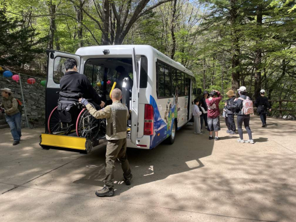 국립공원공단 덕유산국립공원사무소(소장 안길선)는 사회적 교통약자(노약자, 장애인, 임산부 등) 탐방 편의를 도모하고, 탄소중립 정책에 부응하기 위해 ‘친환경 전기셔틀버스’를 무료 운행한다고 밝혔다. 이번 셔틀버스는 오는 4월 18일 ~ 10월 31일까지 구천동주차장 ~ 백련사(약6.1km)구간에 하루 5회 왕복 운행할 예정이며, 매주 월요일은 차량 정비를 위해 운행하지 않는다. 친환경 셔틀버스 도입은 누구도 소외되지 않는 보편적 탐방권 보장과 지속가능한 탄소중립 실현이라는 시대적 가치를 현장에서 구현하고자 한 것으로, 휠체어 리프트를 완비한 15인승 전기버스를 통해 교통약자의 이동편의를 실질적으로 높임으로써 모두가 평등하게 누리는 국립공원 서비스를 제공하는데 의미가 있다. 김양겸 덕유산국립공원사무소 자원보전과장은 “친환경 전기셔틀버스 운행을 통해 탐방객의 불편함이 최소화되도록 최선을 다할 예정이며, 안전하고 질서 있는 이용을 위해 탐방객 여러분의 협조를 부탁드린다”고 말했다./무주=김정오기자 |